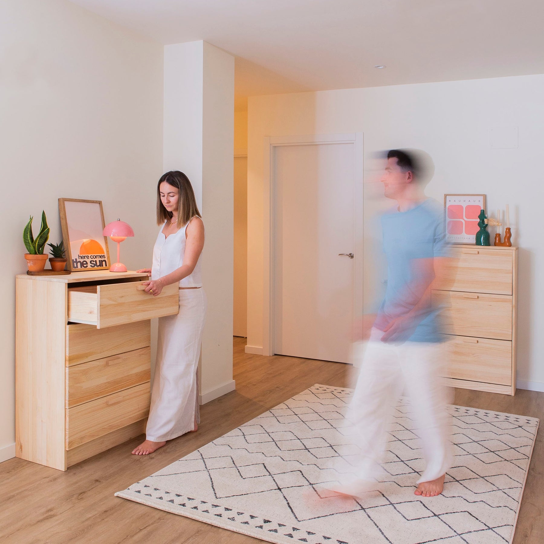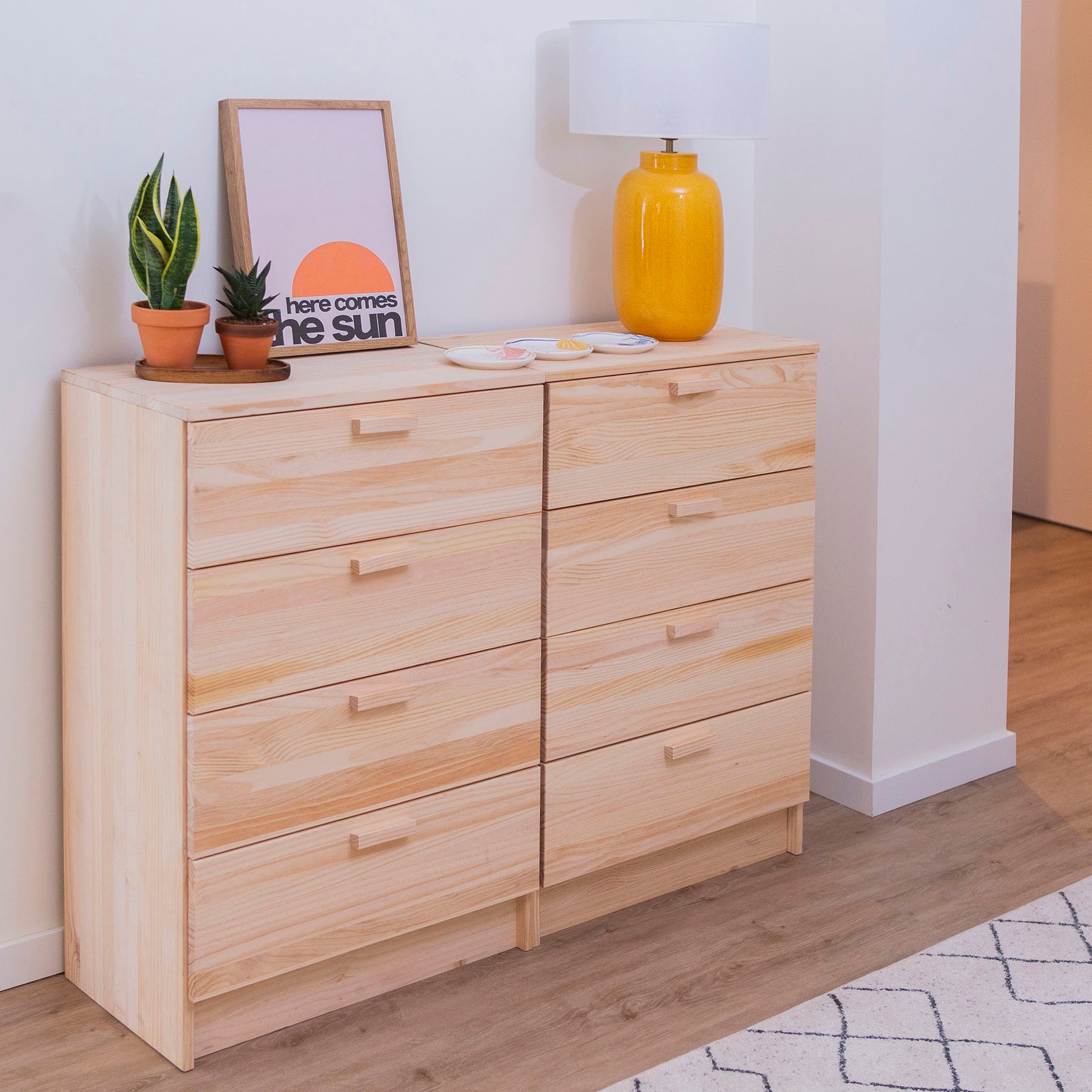 Die Möbelserie VITA steht für mediterranen Flair. Hol dir mit der Kommode aus massivem Kiefernholz Helligkeit und Leichtigkeit in dein Zuhause. Das Kiefernholz bringt Wärme und Freundlichkeit in jeden Raum. Die natürliche Maserung macht jedes Stück zum Unikat und sorgt für eine wohnliche, sonnige Atmosphäre. Gefertigt aus robustem Kiefernmassivholz begleitet dich diese Kommode viele Jahre zuverlässig im Alltag. Dank hochwertiger Metall-Gleitführungen lassen sich die Schubladen leichtgängig öffnen und schließen – selbst bei voller Beladung. Das PEFC-zertifizierte Holz stammt aus nachhaltig bewirtschafteten Wäldern und steht für verantwortungsbewussten Umgang mit Ressourcen. Ob als Esszimmerschrank für Geschirr, als praktische Flurkommode für Mützen, Tücher und Schlüssel oder als Kleideraufbewahrung im Schlafzimmer – dieses Möbelstück ist ein vielseitiger Ordnungsheld. Die großzügigen Schubladen bieten reichlich Stauraum, während die warme Optik der Kiefer deinen Einrichtungsstil harmonisch unterstreicht.